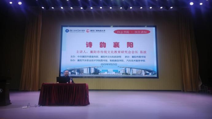 (通讯员:汤凌云)秋意正浓,书香与古韵交织。9月25日下午,由中共襄阳市委宣传部、襄阳市文化和旅游局主办,襄阳市图书馆承办的“白云书院 汉江讲坛”讲座活动在襄阳汽车职业技术学院科学会堂圆满举行。本次讲座由襄阳汽车职业技术学院图书馆副馆长陈志华主持,学校党委委员副校长王晓红、襄阳市图书馆吴楠、建筑工程学院书记李勇和建筑工程学院的500多名师生参加活动。